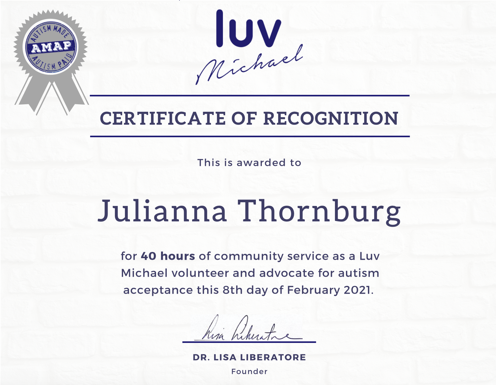 Below is a picture of my certificate of completion for the luv Micheal volunteer work: