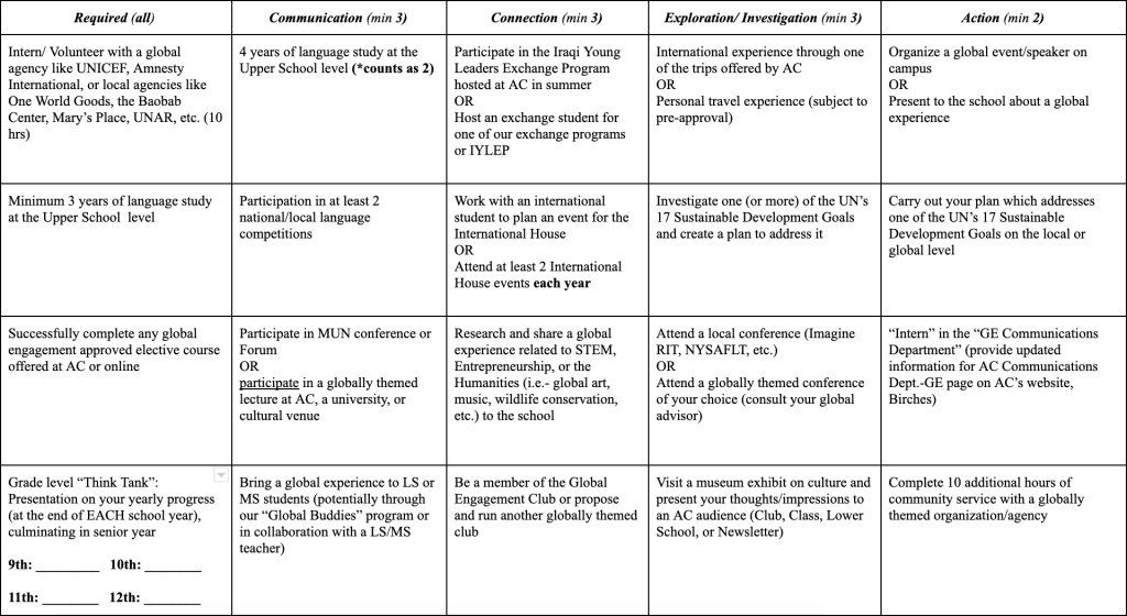 The global diploma can be achieved by completing the bellow chart. The chart describes globally/locally related actives or projects that a certain amount of must be done in order to get a global diploma.